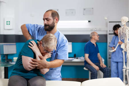 Medical assistant raising arms of elder person to stretch muscles and treat physical injury. Osteopathy specialist doing mobility exercise with senior man at physiotherapy appointment.