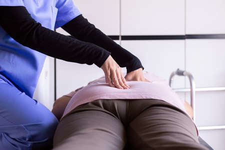 Physiotherapist doing treatment to senior woman patient in clinic ,Elderly women suffering from low-back lumbar pain,Physical therapy concept