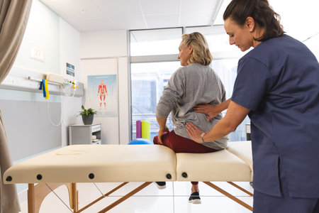 Caucasian female physiotherapist and senior woman massaging back at hospital. Hospital, physiotherapy, work, medicine and healthcare, unaltered.