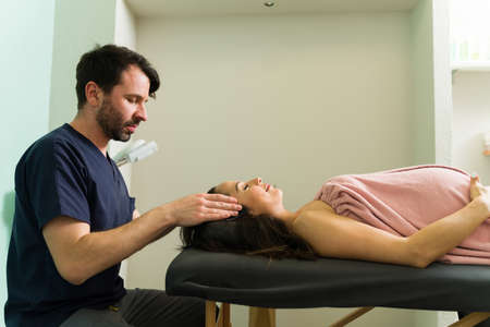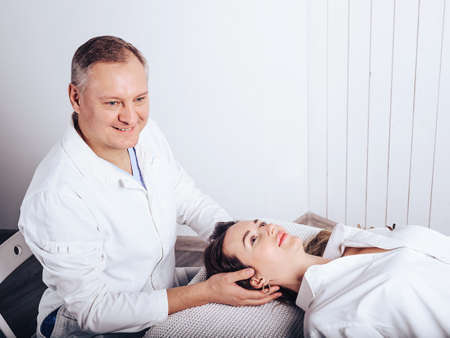 Session of craniosacral therapy, cure of teen boys jaw and neck by a doctor therapist. Craniosacral therapist touches the boys cheeks and checks corrects of the jaws by hands at the hospital.