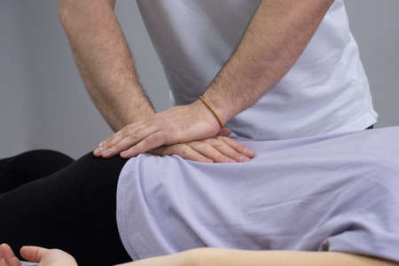 Manual therapist doing manual adjustment on patients spine. Chiropractic, osteopathy, manual therapy, post traumatic rehabilitation, sport physical therapy. Alternative medicine, pain relief concept.