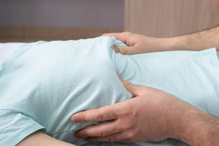 Male physiotherapist hands doing manual massage on female abdomen in medical office