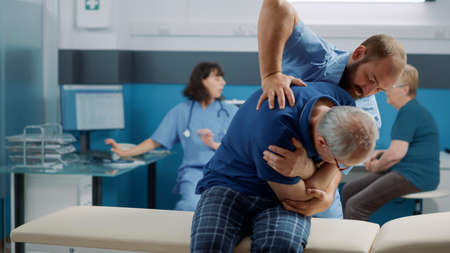 Physiotherapist helping senior man to crack back bones and do physical exercise for injury recovery. Male osteopath using stretching procedure to increase mobility and heal patient.