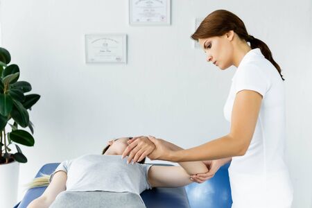 Portrait of female physiotherapist rehabilitating male patient arm. Muscle rehabilitation physiotherapy. Physiotherapist woman evaluating a patient's arm in the office