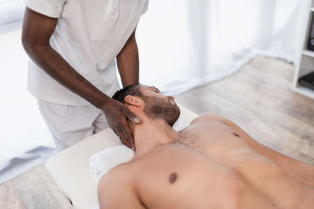 african american chiropractor treating young man in rehabilitation center