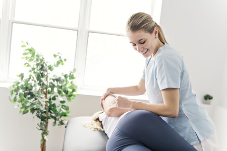 The female doctor takes care of the pain in the sore muscles and the legs of the pregnant woman due to the weight gain of the baby. In each month, the doctor uses a gentle massage hand to relax.