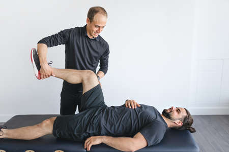A professional physiotherapist is stretching the patient's legs, the patient has muscle dysfunction due to hard work, most often an office worker who has problems sitting for long periods of time.
