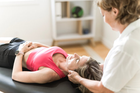 less than one masseur performing a neck massage to a beautiful woman lying down