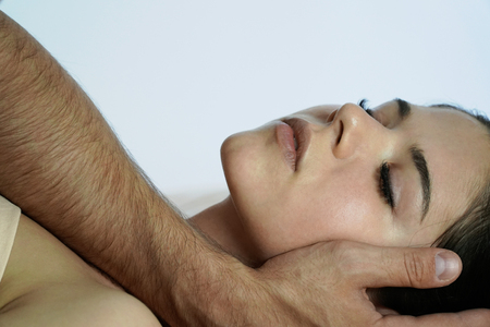 Osteopath treatment - the medical master holding the neck of young woman