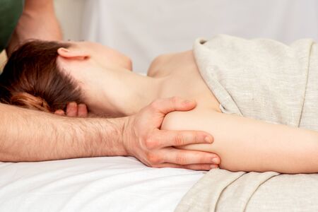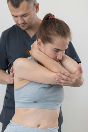 Physical therapist does manual therapy to a young athletic guy at medical office. Concept of manual therapy and osteopathy
