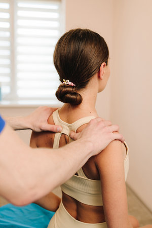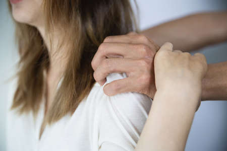 Young woman receiving shoulder massage, close up.