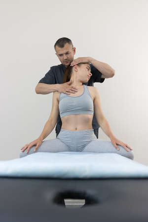 Chiropractic getting mobilization cervical spine of a woman. Manual therapy. Neurological physical examination. Osteopathy, physiotherapist