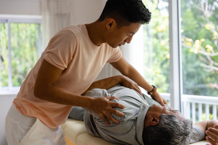 Diverse male physiotherapist advising and senior male patient stretching arm. Physiotherapy, healthcare, wellbeing and senior lifestyle, unaltered.