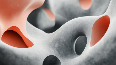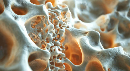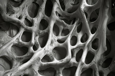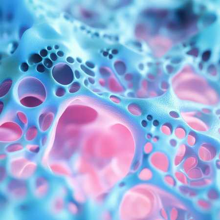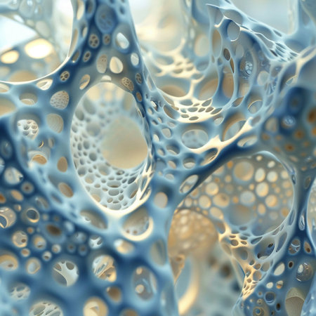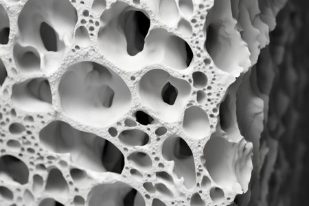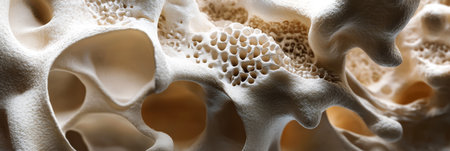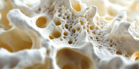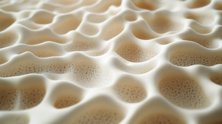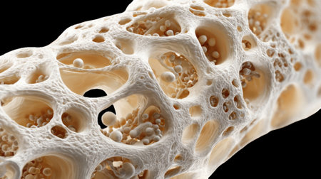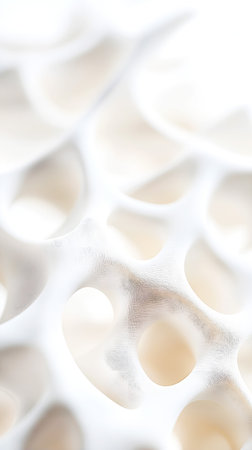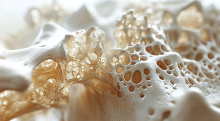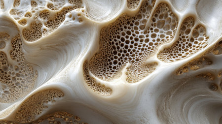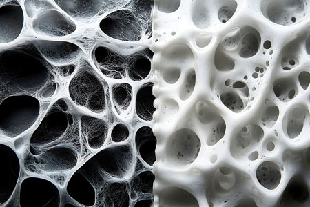 Abstract close-up of a porous organic structure, resembling bone or biomaterial, with a transition from a fibrous network to a solid texture, symbolizing science