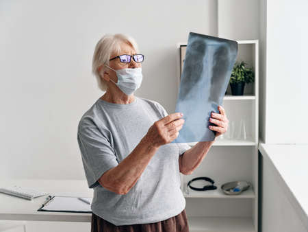 Portrait of elder woman sitting in medical office at checkup visit. Senior patient waiting on physician to attend consultation appointment exam, receiving medical treatment and medicine.