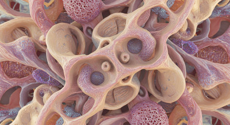 This closeup shows the complex bone structure and the process of bone resorption, where osteoclasts break down tissue, essential for healthy bone metabolism and skeletal function
