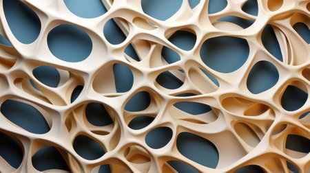 An artistic photograph suitable for topics related to modern art, design innovation, or architectural inspiration | This image offers a mesmerizing look at a modern, abstract design that exudes organic fluidity through interconnected shapes and soft color tones. The sinuous lines and curves create an almost skeletal structure, akin to a close-up of cellular forms or a flowing organic network. The palette of whites and creams set against deep shadows provides a graceful contrast that highlights the three-dimensionality of the piece, engaging the viewer's eye through its labyrinth of rounded openings and bridges. The soft, diffused lighting accentuates the gentle gradients and subtle intricacies, turning the piece into a visual paradox of complex simplicity. The design invites interpretations linked to natural patterns, suggesting a bridge between art, biology, and the mathematics of naturally occurring forms | This photograph is optimal for creative projects that require an abstract element with a sense of depth and organic connectivity. It can be used as a thought-provoking piece in art galleries, a background for digital or print design spaces, or as a complementary image in discussions about the intersection of nature and geometry. Additionally, it is well-suited as part of an aesthetic mood board for interior designers targeting minimalistic yet dynamic spaces or as a bold statement in architectural concept presentations | a detailed shot emphasizing the beauty and intricacy of abstract art, captured in a color scheme that promotes a calm yet engaging atmosphere, with ample space for overlaying text or additional graphic elements