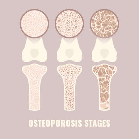 Osteoporosis stages infographic set of bone mass loss process. Different density femur cavity tissue close-up. Skeletal system disease. Senior osteopathy medical concept for diagnostics centers.