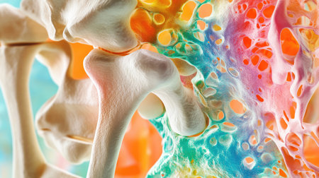 This colorful illustration depicts the intricate structure of human bones, emphasizing the effects of osteoporosis on bone density and health.