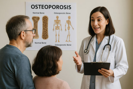 Female doctor holding clipboard explaining osteoporosis to senior couple, using anatomical poster showing normal and osteoporotic bone structure