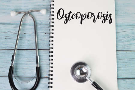 Top view of stethoscope and notebook written with OSTEOPOROSIS. Health concept