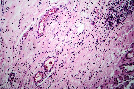 Breast fibroadenosis, light micrograph, photo under microscope. Common benign hyperplastic process involving breast glands