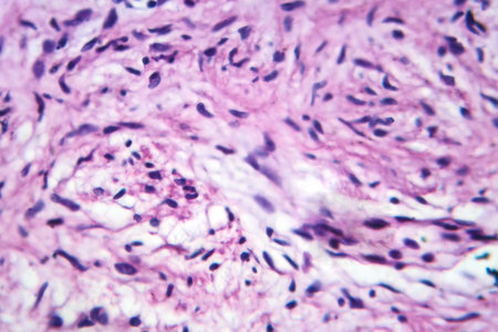 Photomicrograph of a neurofibroma tissue sample in neurofibromatosis genetic disease under a microscope, revealing spindle-shaped cells within a myxoid stroma and wavy nuclei.