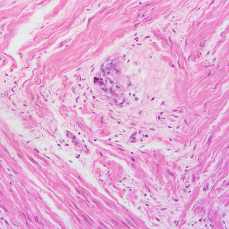 A microscopic view of tissue with pink and purple staining, showing cellular structures and patterns