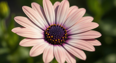 A striking close-up photograph captures a single African daisy in full bloom. The flower's petals are a soft, light pink hue, radiating outwards from a highly contrasting and deep purple central disc. The center is further accented by small, bright yellow stamens clustered around the edge of the purple core. The background is intentionally blurred into a soft, green bokeh effect, emphasizing the intricate details and vibrant colors of the delicate flower.