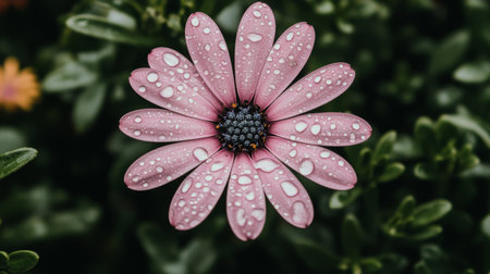 A stunning close-up image capturing the beauty of a pink flower adorned with glistening dew drops, set against lush green foliage, highlighting nature's serene elegance.