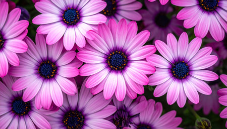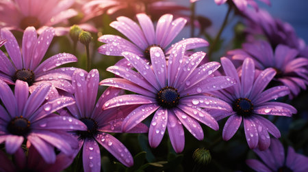 A stunning close-up of vibrant pink daisies showcases their intricate petals and rich purple centers, sparkling with morning dew. This enchanting floral scene radiates freshness and beauty, inviting viewers to appreciate natures artistry