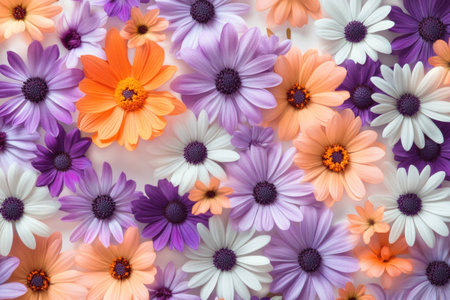 Vibrant floral background featuring a variety of colorful daisies in purple, orange, and white, perfect for springtime and nature themed designs