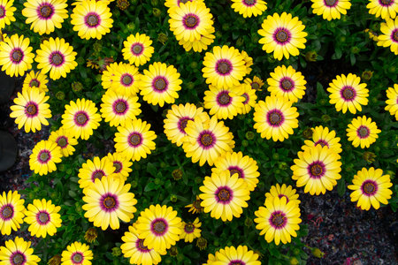 Yellow Osteospermum flowers with purple centres in a flower bed