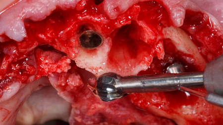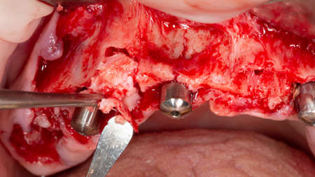 Dentist surgeon pulls out a new dental implant. Installation of implants in a modern dental clinic. Blood on the gloves. Only hands. Close-up. Copy space.