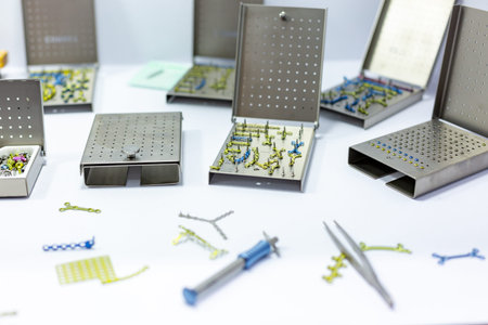 Surgical kit of instruments used in dental implantology. Dentist orthopedist tools. Dentistry. Dental implantation surgical set.