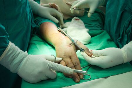 Process of trauma surgery operation. Group of surgeons in operating room with surgery equipment. Medical background