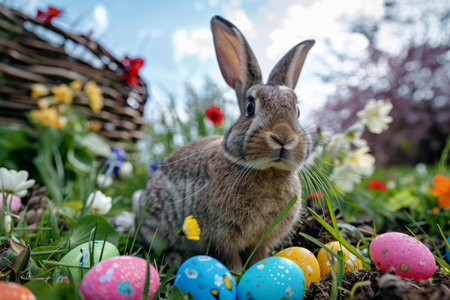 Cute rabbit in a lush garden with vibrant easter eggs on a sunny day