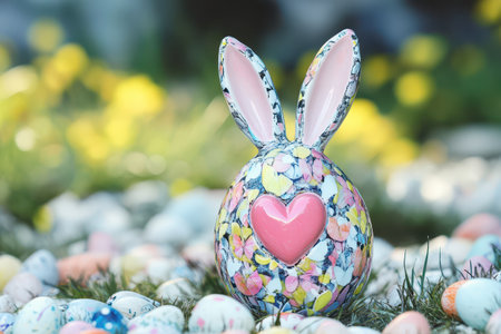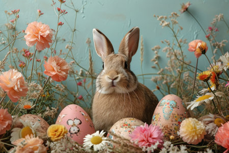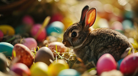 A charming Easter bunny nestled amongst vibrant, painted eggs. A heartwarming springtime scene.