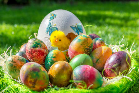 Colored or decorated Easter eggs in the basket and Easter Bunnies on the green grass under blooming spring bushes on a sunny day.
