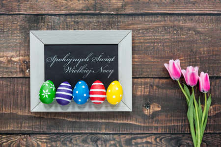 Image of Easter greetings in Polish, tulips and Easter eggs