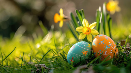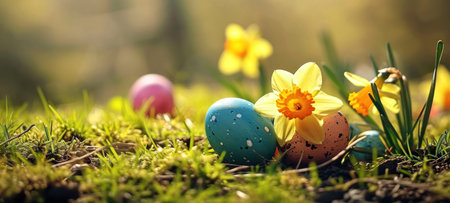 Easter eggs hiding in the grass with daffodil --ar 16:9 --v 6 Job ID: b9d37c12-5d67-4260-b0f6-8667c5a01df9