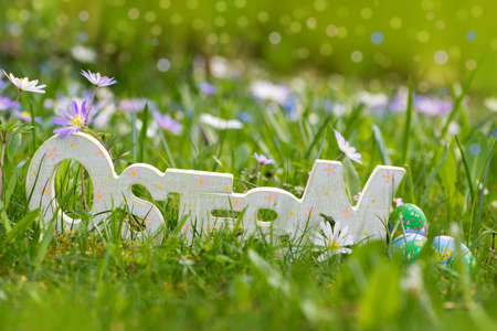 Happy Easter words written in multicolored wooden alphabet letters on a bright green yellow background. Minimalistic Easter background. Greeting card for Christian or Catholic Easter. Place for text.