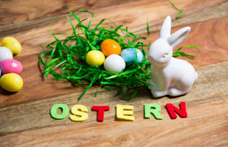 Easter decoration with eggs and bunny on wooden table. Selective focus.