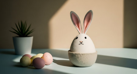 A white Easter bunny figurine with pastel eggs and a potted plant on a table