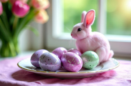 Colored painted eggs for Easter are on a plate, and a rabbit is sitting next to it, against the background of the window. the image was created using AI