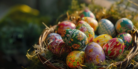 A vibrant collection of pastel-colored Easter eggs nestled in a natural basket, surrounded by lush green grass, creating a perfect spring holiday scene.