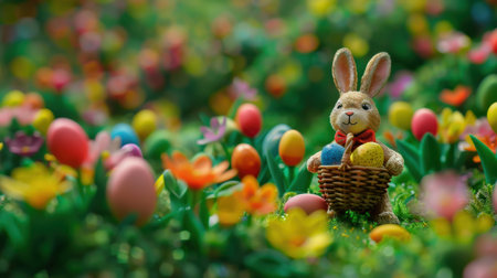 Cheerful spring scene of a green field filled with vibrant flowers and scattered, brightly colored easter eggs. a cute bunny in a bowtie stands in the foreground, holding a basket filled with colorful eggs, symbolizing easter joy.