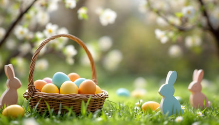 A charming scene featuring a wicker basket filled with vibrant, colorful Easter eggs sitting on lush green grass, surrounded by wildflowers. Perfect for spring themes.