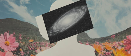 Minimalist collage blending geometric shapes and swirling galaxy against a floral backdrop