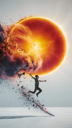 A man's hair bursts into a cascade of tiny particles, radiating outward in a vibrant explosion of energy. The bright, dynamic particles symbolize creativity and transformation, creating a surreal and striking visual impact.
